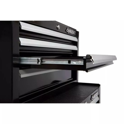 This Husky 26 in. W 4-Drawer Tool Chest is perfect for all of your storage needs. Durable 50 lbs. ball-bearing drawers with smooth detent retention, full width drawer trim, and included drawer liners provide easy access and organization when you need it, while the internal locking system provides security when you are away. Gas struts keep the lid open during use, and a custom Husky embossed stiffener provides extra stability to the lid.